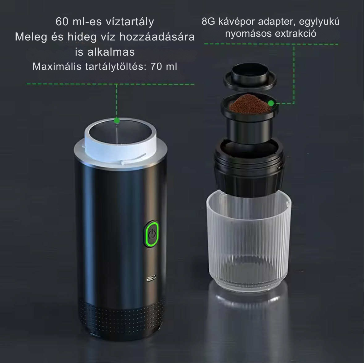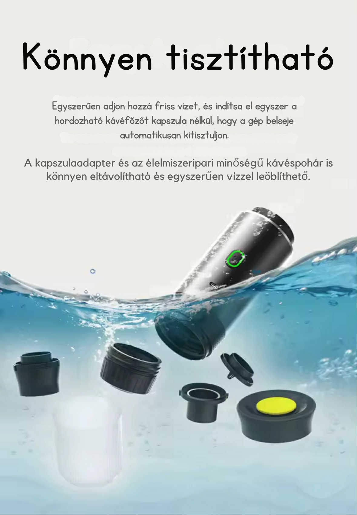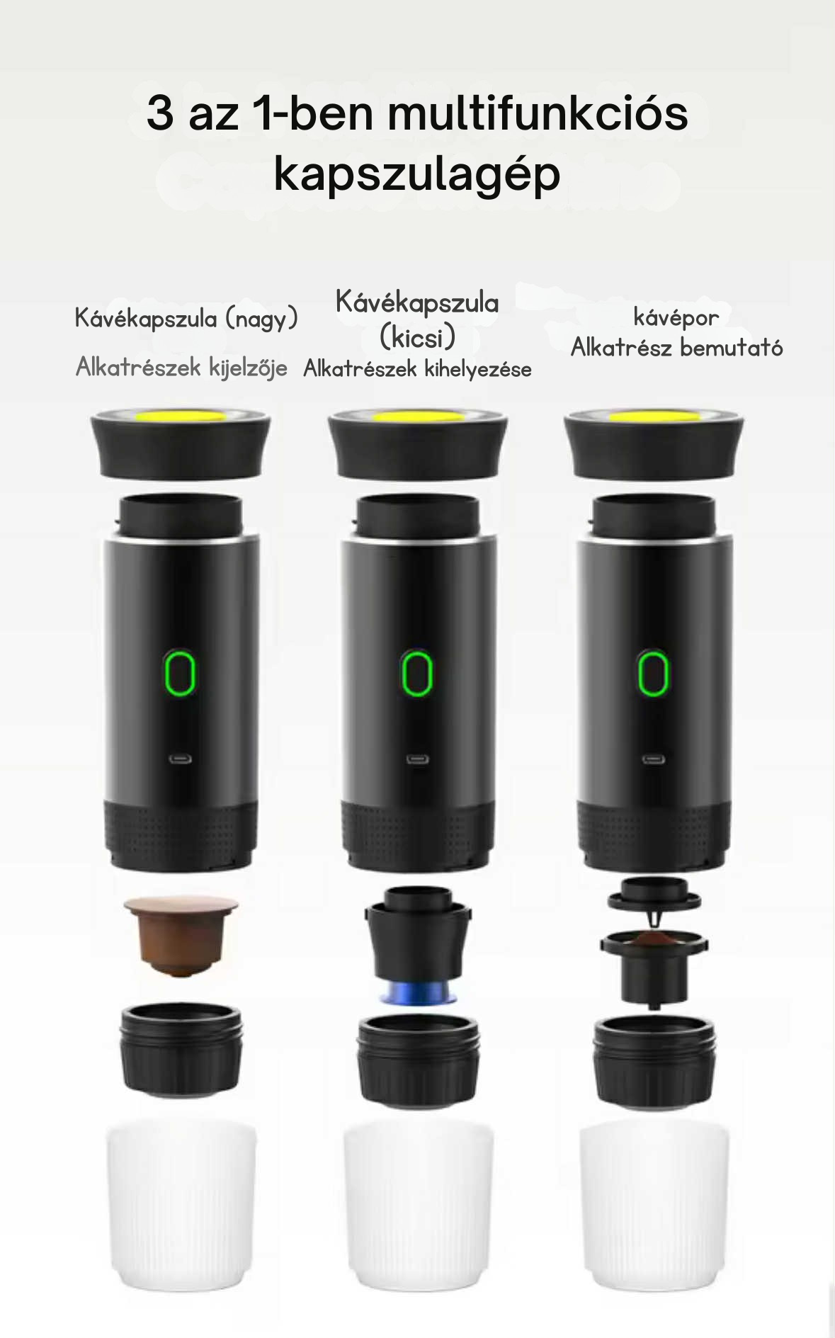 Ez a hordozható, vezeték nélküli kávéfőző a modern életstílushoz lett tervezve: akár autóban, otthon, irodában vagy a szabadban, mindig biztosítja a friss, illatos kávét.