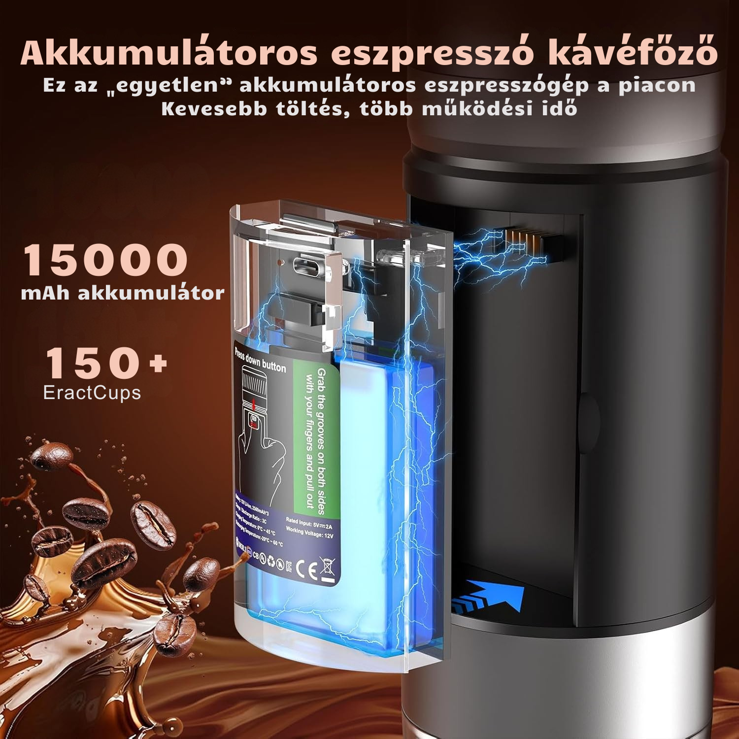 PocketCaffé – Hordozható, vezeték nélküli kávéfőző (fekete)