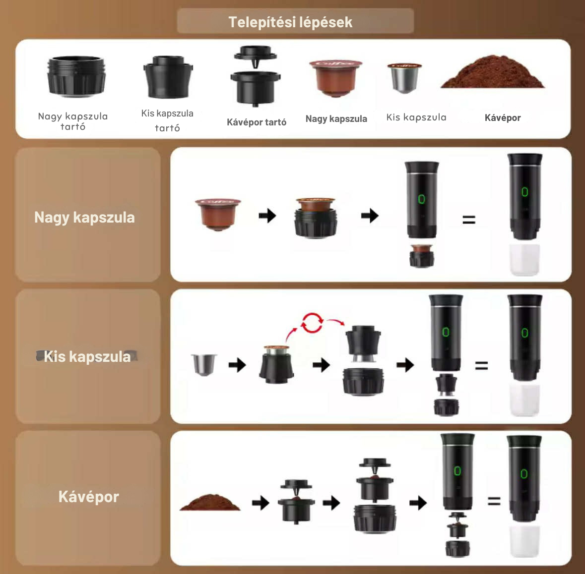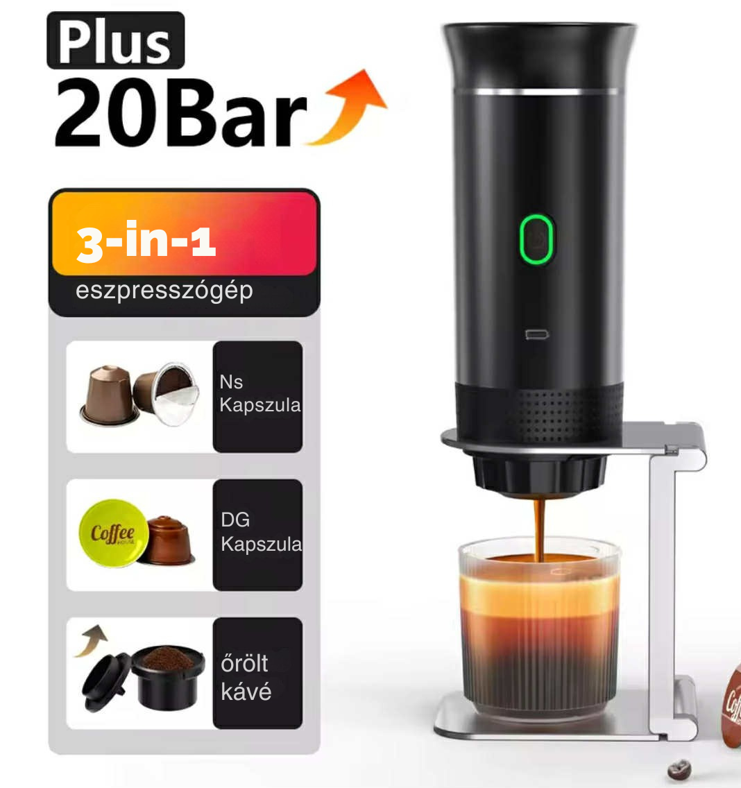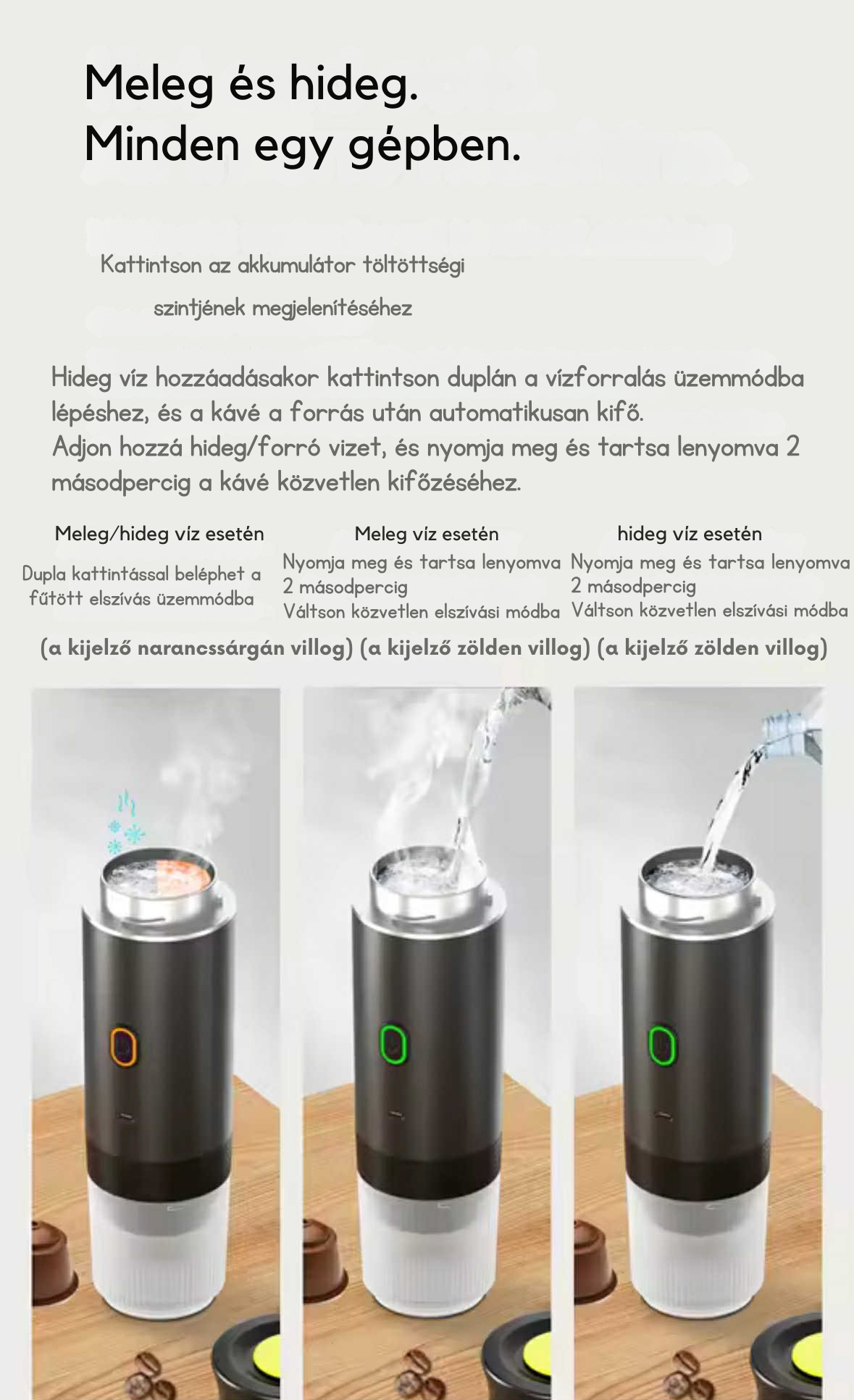 Ez a hordozható, vezeték nélküli kávéfőző a modern életstílushoz lett tervezve: akár autóban, otthon, irodában vagy a szabadban, mindig biztosítja a friss, illatos kávét.